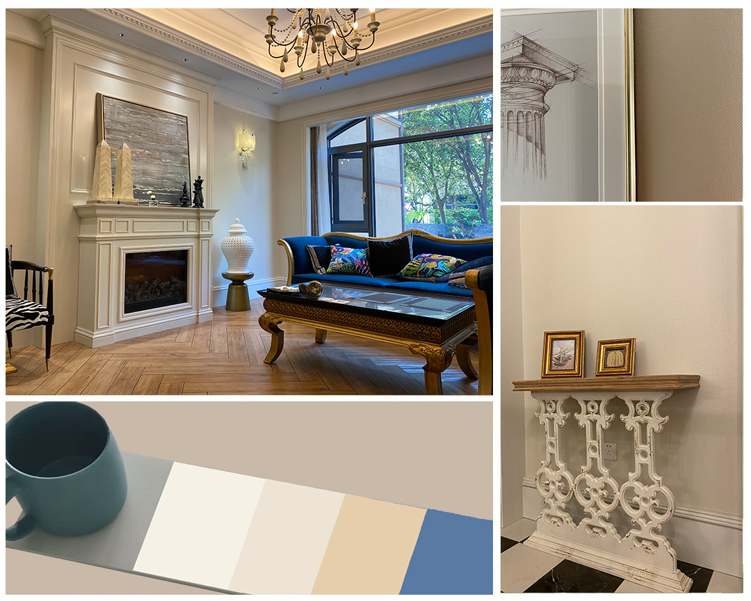 暖色調(diào)為主,美式現(xiàn)代為基底,墻面使用維圖藍(lán)CF764,沒有喧賓奪主,與木色地板相呼應(yīng),層層遞進(jìn)、疊加,讓