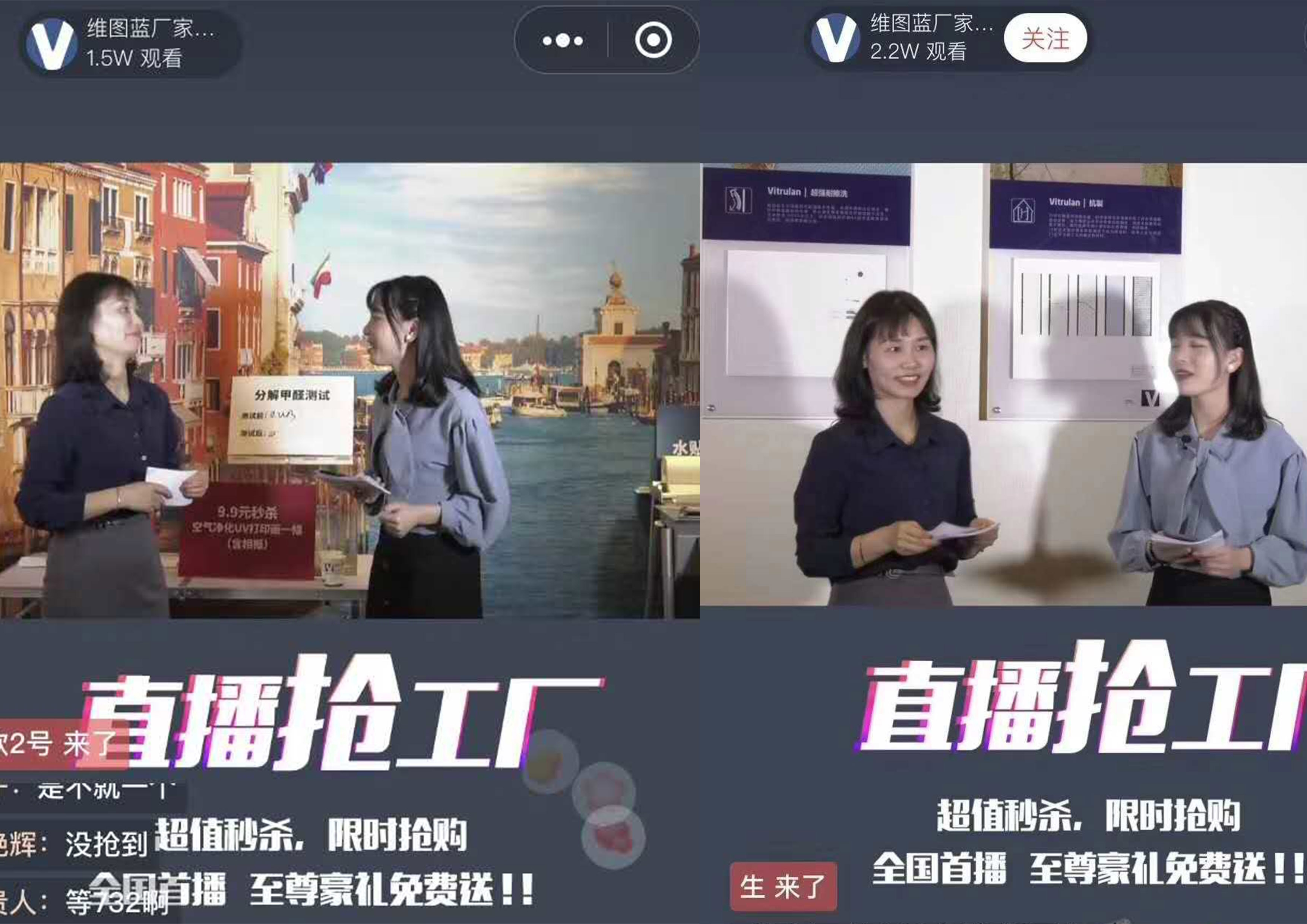 直播期間,維圖藍(lán)展廳經(jīng)理——高顏值主播楊海菊,首先向大家介紹了維圖藍(lán)德國總部企業(yè)介紹以及維圖藍(lán)品牌優(yōu)勢。隨后,通過維圖藍(lán)熱銷功能特性產(chǎn)品--【水貼系列】和【空氣凈化系列】的凈化甲醛實驗測試和用水粘貼壁布施工演示等干貨,獲得了直播間觀眾的一致認(rèn)可。